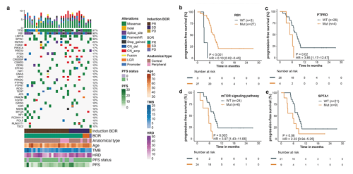 基线组织样本来自30例患者,用于靶向基因测序,以及21例患者,用于WTS。TP53(97%)和RB1(90%)是最常突变的基因。在诱导治疗期间和整个治疗过程中,未观察到基因组突变与反应(完全缓解/部分缓解)之间有显著相关性。
