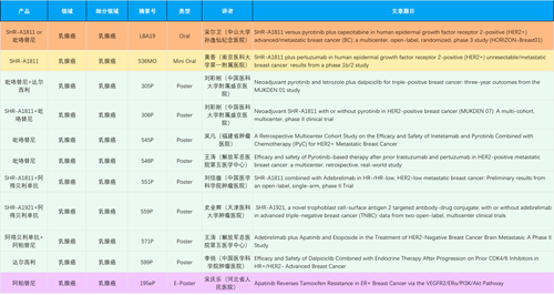 在乳腺癌领域,PG创新产品相关研究共入选1项口头报告、1项简短口头报告、8项壁报和1项电子壁报,共11项研究。吡咯替尼、达尔西利、阿得贝利单抗、瑞康曲妥珠单抗等新老创新药物,均有多篇研究入选,展现出PG医药在乳腺癌领域多年深耕的丰硕成果。